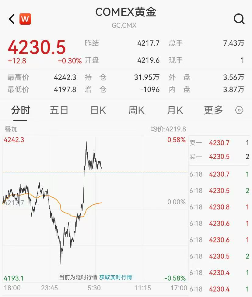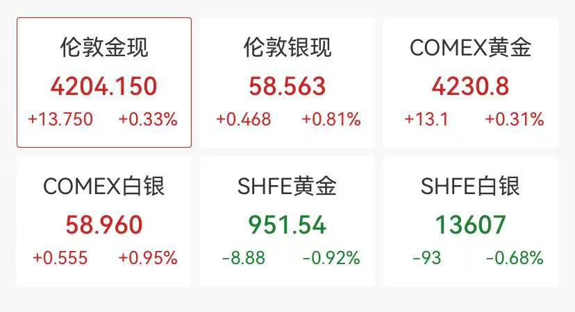 12月9日,国际贵金属价格剧烈波动,COMEX黄金期货价格突然急速下挫,一度失守4200美元大关,随后震荡回升,截至北京时间19:30,报4232美元/盎司,涨超0.3%;COMEX白银盘中跌破59美元/盎司,现已回升至附近。